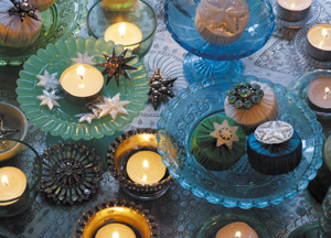 bildreich karten PK 371: weihnachten bei valentina. Querformat. (Teelicht, Kerzen, Glas, Teller) Mindestbestellmenge: 15 Karten (auch assortiert).