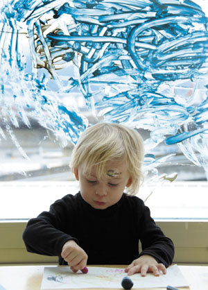 bildreich karten PK 446: spuren. Hochformat. (Kindergarten, Hort, Schule, Kita, Malen, Farben, Stuhl, Tisch, Junge) Mindestbestellmenge: 15 Karten (auch assortiert).
