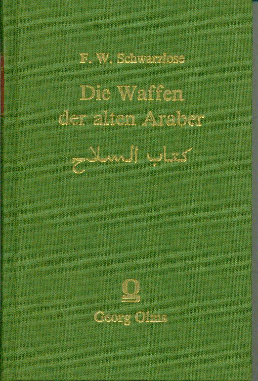 Schwarzlose, Friedrich Wilhelm: Die Waffen der alten Araber aus ihren Dichtern dargestellt: Kitab al-silah Ein Beitrag zur arabischen Alterthumskunde, Synonymik und Lexicographie. Hildesheim: Olms 1982. 8°. XVI, 392 S., Leinen (gut erhalten) Nachdruck der Ausgabe Leipzig 1886 bei J.C. Hinrich.