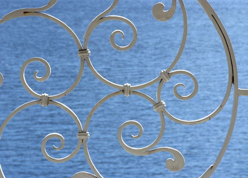 bildreich karten PK 623: sonnentag. Querformat. (See, Meer, Balkon, Geländer, Ornament, Aussicht, Ausblick, Durchblick, Ferien, Urlaub, Süden, Licht, Sonne)