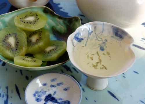 bildreich karten PK 653: tee bei yafang I. Querformat. (Obst, Kiwi, Porzellan, Chinesisch, Japanisch, Grüntee, Tee, Pause)