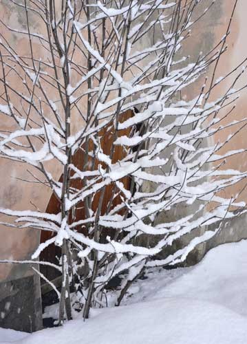 bildreich karten PK 969: frisch verschneit. Hochformat. (Schnee, Baum, Haus, Eingang, Bündner Haus, Engadiner Haus, Engadin) Mindestbestellmenge: 15 Karten (auch assortiert).