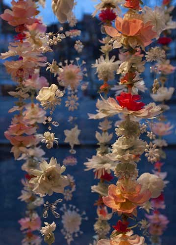 bildreich karten PK 994: valentinas adventsgirlanden. Hochformat. (Schmuck, Girlande, Kunstblumen, Blumenkette, Lichterkette, Schaufenster, Weihnachtsschmuck, Dämmerung, Dämmerlicht) Mindestbestellmenge: 15 Karten (auch assortiert).