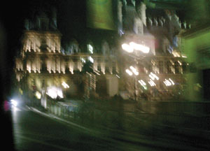 bildreich karten PK 33: nachtflug I. Querformat. 2003. (Paris, Nacht, Hotel de maire, Neon) Mindestbestellmenge: 15 Karten (auch assortiert).