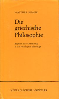 Kranz, Walther: Die griechische Philosophie. Zugleich eine Einführung in die Philosophie überhaupt. Birsfelden-Basel: Schibli-Doppler 1976. 8°. X, 353 S., Pappband Schutzumschlag mit leichten Randläsuren und teiweise abgeblasst; gut erhalten)