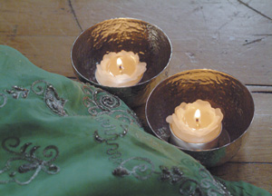 bildreich karten PK 210: abendstill. Querformat. 2006. (Teelichter, Paar, Kerzen, Stoff, Tuch, Holz, Parkett, Silber, Stickerei) Mindestbestellmenge: 15 Karten (auch assortiert).