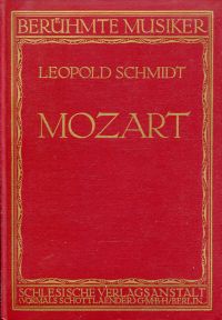 Schmidt, Leopold: W. A. Mozart. 2., vermehrte und verbesserte Auflage. Berlin: Schlesische Verl. Anst. 1920. 4°. 148 S., zahlreiche sw-Abbildungen, Tafeln, Leinen (Papier altersbedingt leicht gebräunt; altersgemäss gut erhalten) (=Berühmte Musiker, Bd. 19)