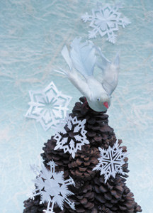 bildreich karten PK 378: jennifers weihnachtsbaum. Hochformat. (Schnee, Eis, Schneesterne, Scherenschnitt, Föhrenzapfen, Vogel, Weihnachtsdekoration, Dekoration) Mindestbestellmenge: 15 Karten (auch assortiert).