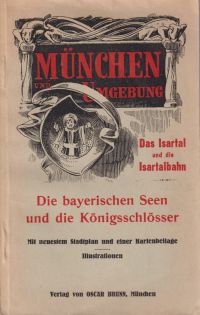 Sailer, Josef Benno: München und Umgebung. [Das Isartal u. d. Isartalbahn ; Die bayer. Seen u. d. Königsschlösser]. Grosse Ausg. München: Brunn 1924. Kl.-8°. 88, VIII S. Mit neuestem [farb.] Stadtpl., 1 [farb.] Übersichtskt. u. vielen [eingedr.] Illustrationen, Broschiert (leicht abgegriffen; Papier altersbedingt leicht gebräunt; sonst gut erhalten)