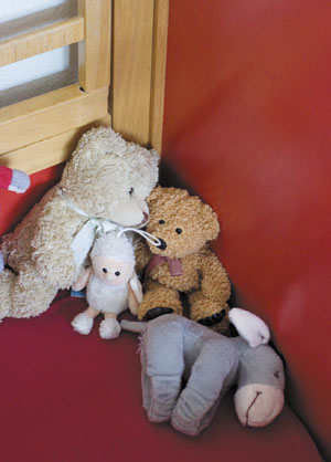 bildreich karten PK 443: nachtgefährten. Hochformat. (Kinderzimmer, Bett, Stofftiere, Plüschtiere, Spielzeug, Geburt) Mindestbestellmenge: 15 Karten (auch assortiert).