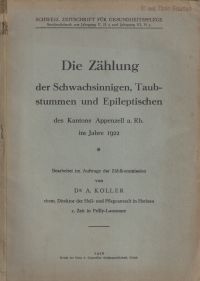 Koller, A.: Die Zählung der Schwachsinnigen, Taubstummen und Epileptischen des Kantons Appenzell a. Rh. im Jahre 1922. Zürich: Hans A. Gutzwiller 1926. Gr.-8°. 194 S., Broschiert (Stempel auf Titelblatt und Umschlag; Einband mit leichten Gebrauchsspuren; Papier altersbedingt gebräunt; sonst altersgemäss gut erhalten) (=Schweiz. Zeitschrift f. Gesundheitspflege, V/5 VI/3)