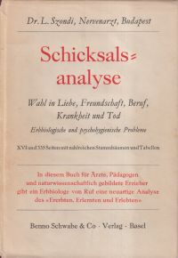 Szondi, Leopold: Schicksalsanalyse. Wahl in Liebe, Freundschaft, Beruf, Krankheit und Tod. Erbbiologische und psychohygienische Probleme. Basel: Schwabe 1944. Gr.-8°. XVI, 335 S., zahlreiche Stammbäume und Tabellen, Leinen (Besitzervermerk auf Vorsatz; Papier gebräunt; Schutzumschlag mit leichten Randläsuren und angestaubt; Papier altersbedingt leicht gebräunt; sonst altersgemäss gut erhalten) (=Psychohygiene, Wissenschaft und Praxis ; Bd. 6)