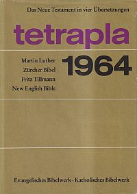 TETRAPLA 1964. Das Neue Testament in vier Übersetzungen: Martin Luther. Zürcher Bibel. Fritz Tillmann. New English Bible. Stuttgart: Evangelisches Bibelwerk 1967. Lex.-8°. 1215 S., Leinen (Besitzervermerk auf Vorsatz; Schutzumschlag mit leichten Randläsuren; gut erhalten)