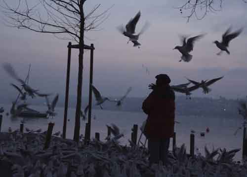 bildreich karten PK 680: die möwenfrau. Querformat. (Frau, Möwen, Vögel, Futter, Füttern, See, Ufer, Promenade, Zürich, Baum) Mindestbestellmenge: 15 Karten (auch assortiert).