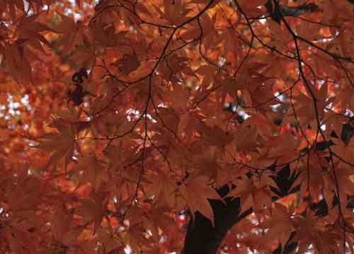 bildreich karten PK 683: rot in rot I. Querformat. (Kyoto, Garten, Tempelgarten, Ahorn, Baum, Regen) Mindestbestellmenge: 15 Karten (auch assortiert).