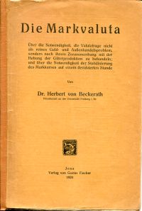 Beckherath, Herbert von: Die Markvaluta. Über die Notwendigkeit, die Valutafrage nicht als reines Geld- und Aussenhandelsproblem, sondern nach ihrem Zusammenhang mit der Hebung der Güterproduktion zu behandeln; und über die Notwendigkeit der Stabilisierung des Markkurses auf einem devalvierten Stande. Jena: Gustav Fischer 1920. Gr.-8°. 37 S. broschiert (Einband hinten mit Fehlstelle; gebräunt; kleine Randläsuren)