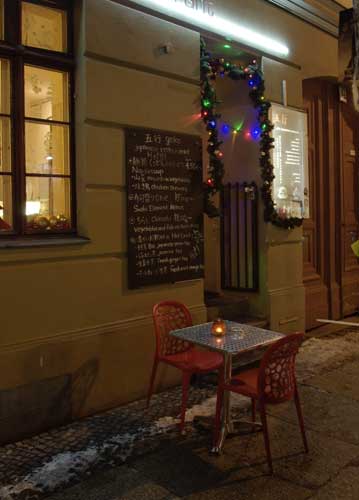 bildreich karten PK 868: winterliche einladung. Hochformat. (Weihnachsdekoration, Gastro, Tisch, Stuhl, Tafel, Schrift, Kreide, Fenster, Eingang, Bürgesteig, Trottoir, Kerze, Licht, Nacht, Abend, Berlin) Mindestbestellmenge: 15 Karten (auch assortiert).