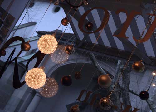 bildreich karten PK 871: emo bistro. Querformat. (Bar, Weihnachtsdekoration, Weihnachtsschmuck, Kugeln, Licht, Glas, Fenster, Nacht, Abend, Advent, Stadt) Mindestbestellmenge: 15 Karten (auch assortiert).