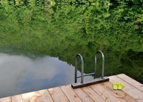bildreich karten PK 939: morgenfrische. Querformat. (See, Wald, Waldweiher, Flipflops, Schuhe, Plattform, Leiter, Einstieg, Spiegelung, Schwimmen, Morgen, Frische, Baden) Mindestbestellmenge: 15 Karten (auch assortiert).