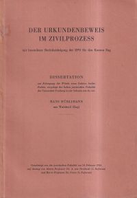 Hürlimann, Hans: Der Urkundenbeweis im Zivilprozeß mit besonderer Berücksichtigung der ZPO für den Kanton Zug. [Zug: Speck] 1944. 8°. 101 S. Broschiert (altersgemäss gut erhalten)