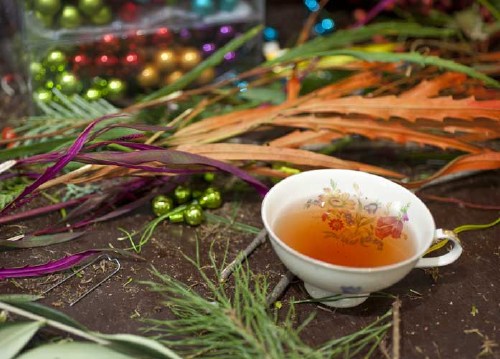 bildreich karten PK 980: adventstee. Querformat. (Teetasse, Florist, Dekoration, Zweige, Arbeitstisch, Tee) Mindestbestellmenge: 15 Karten (auch assortiert).