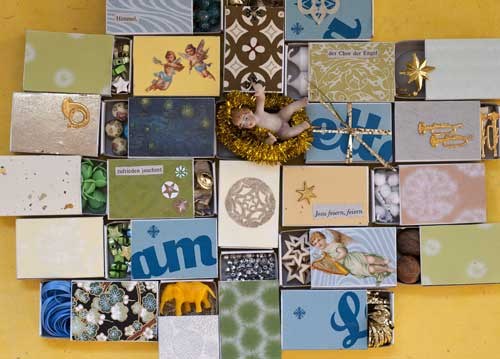 bildreich karten PK 988: ueberraschungsschaechtelchen. Querformat. (Papier, Japan, Zündholzschachtel, Scherenschnitt, Advent, Adventskalender, Lametta, gold) Mindestbestellmenge: 15 Karten (auch assortiert).